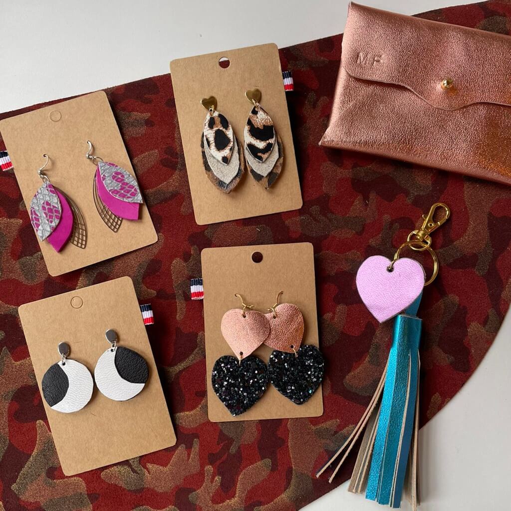 Votre création personnalisée en cuir, au choix : une paire de boucles d’oreille pendantes fantaisies, un porte carte en cuir femme ou homme, un marque page personnalisé, un porte clés pompon en cuir.